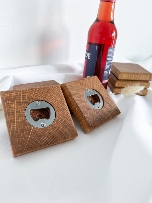 Handgefertigte Eichenholz Untersetzer mit integriertem Flaschenöffner